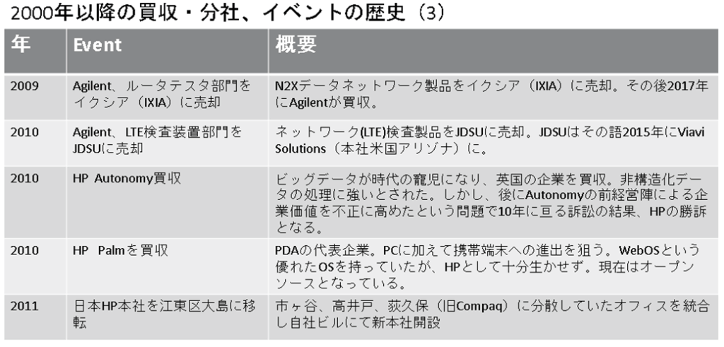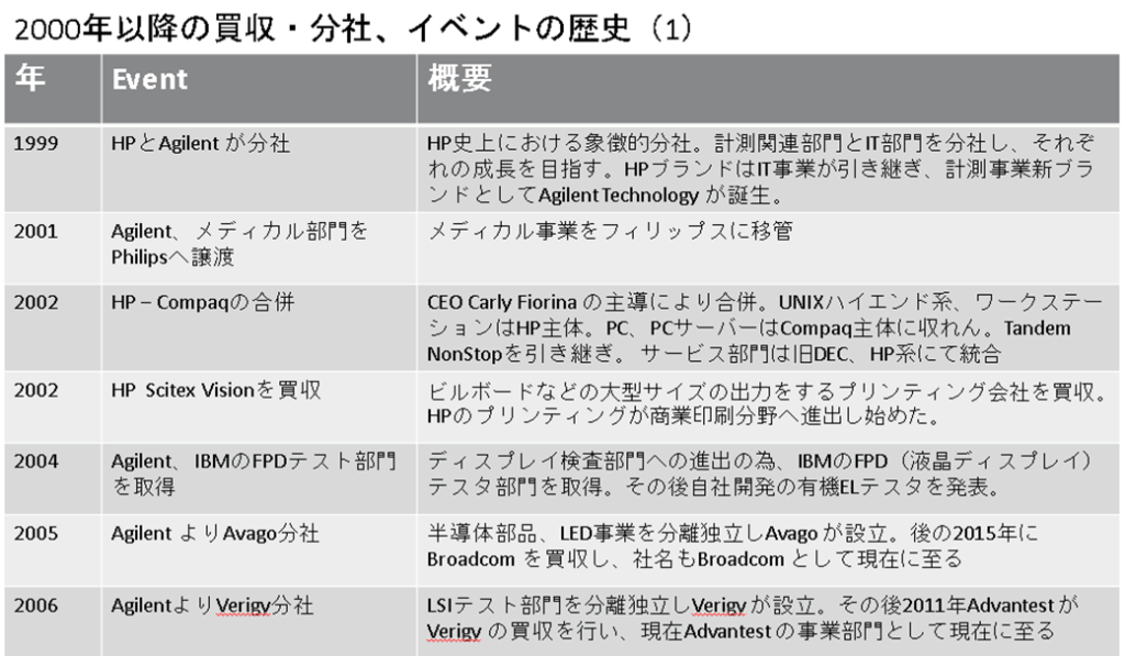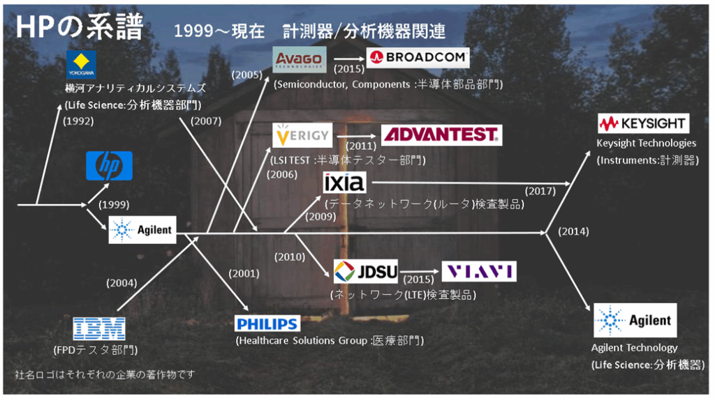 HPOB会員である皆様は、HPが 1999年にコンピュータ系のHP と計測器系の Agilent に別れた事はご存じと思いますが、実はその後も分社、合併などが行われています。単に社名だけを聞いても全く分からない事もあると思いますし、コンピュータの方は「今の計測器/分析機器の会社ってどうなっているの? アジレントだと思っていたら、キーサイトなの?」また計測器・分析器の方は「今のHP と関連の会社ってどうなっているの?」という声がありました。 そのような声に応えるため、また、今後OB会にHPの系譜の会社から会員が入って来たときも、「知らない会社だなー」とならないように、ここで一度系譜をまとめて会員の皆様に紹介しようと言う事になりました。